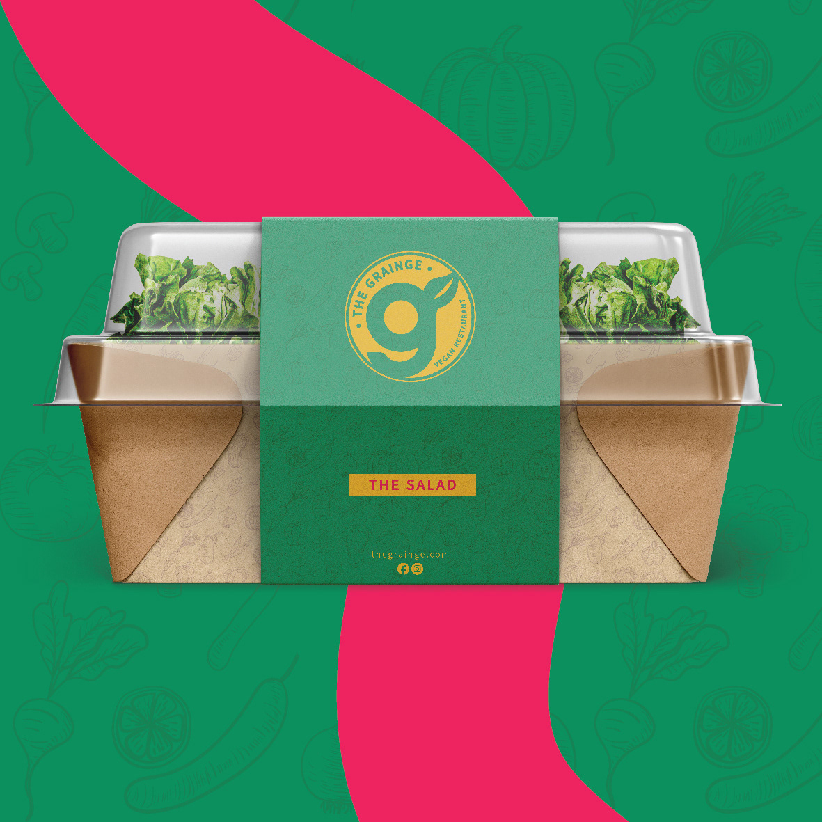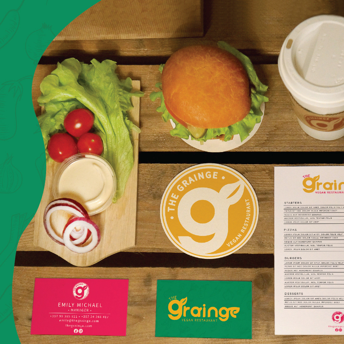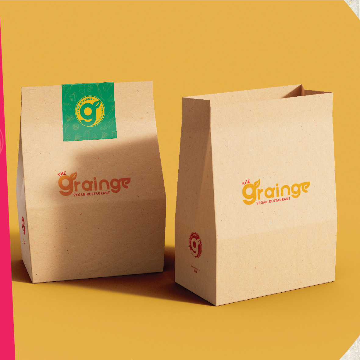 The Grainge is a conceptual vegan restaurant branding project created as part of a design challenge. The goal was to develop a modern and inviting identity that reflects the freshness and vibrancy of plant-based cuisine. The brand’s visual language is bold and energetic, featuring a warm color palette and playful typography that captures the essence of natural, wholesome food.